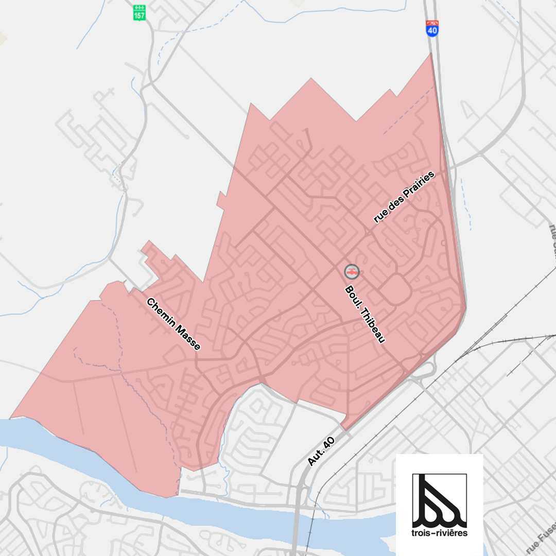 - Dans le périmètre délimité par le boulevard Thibeau, la rue Pie-XII jusqu’à la rivière Saint-Maurice, la rue des Prairies, le chemin Masse jusqu’à la rue David et tout le secteur des Capitales;