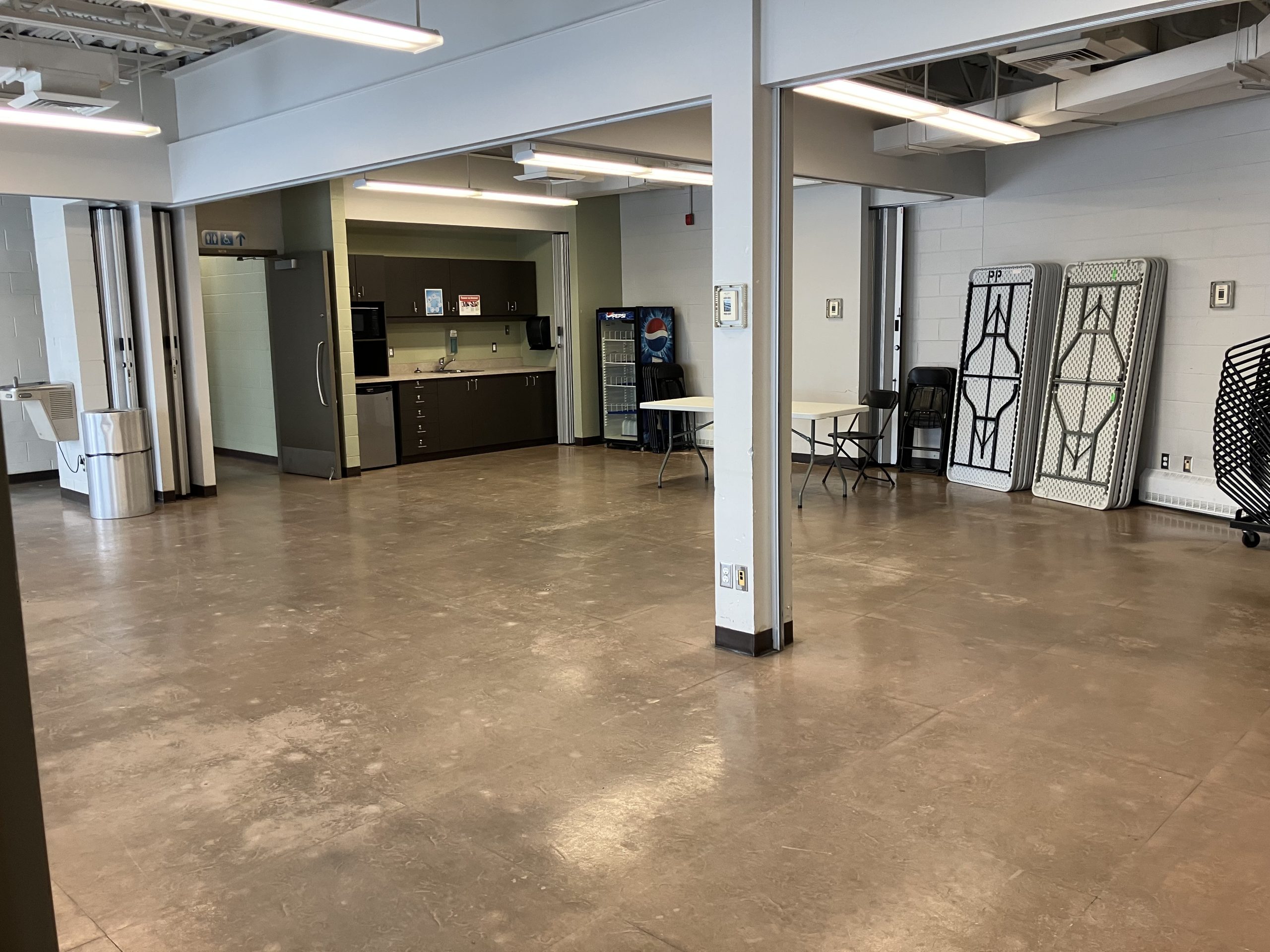 - Salle : 55′ X 82′ (16,76 m X 24,99 m). Possibilité de diviser la salle en trois parties (partie gauche, partie centre et partie droite avec la scène).