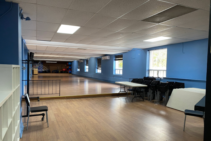 - salle B : 64′ X 38′ (19,5 m X 11,58 m)